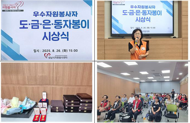성남시에 등록된 자원봉사자는 현재 37만2천 명이 넘는다. 580개 봉사단체가 430곳에서 자원봉사를 한다. 지난 8월 말 성남시 자원봉사센터에서 도자봉이(2만 시간) 3명, 금자봉이(1만5천 시간) 1명, 은자봉이(1만 시간) 4명, 동자봉이(5천 시간) 12명에게 인증패와 훈장이 전달됐다.