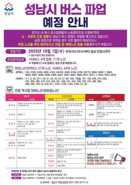 성남시는 파업으로 인한 시민 불편을 최소화하기 위해 버스정류장에 안내문을 부착하고, 지하철역 인근 28곳에 안내 현수막을 설치했다. 또한 버스정보시스템(BIS) 안내 메시지 송출, 시 홈페이지 게시, 재난문자 발송 등 다양한 홍보 매체를 활용해 대체 노선을 적극 안내하고 있다.