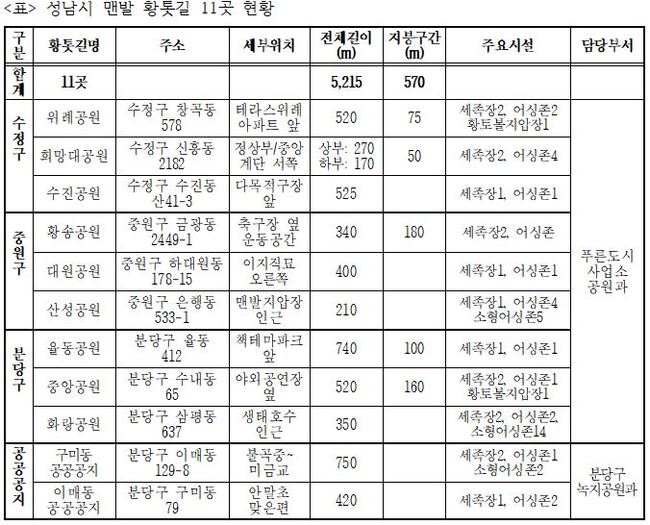 이번 10곳 로터리 작업 대상 황톳길(길이)은 △ 위례공원 내 520m 구간 △ 희망대공원 내 440m 구간 △ 수진공원 내 525m 구간 △ 황송공원 내 340m 구간 △ 대원공원 내 400m 구간 △ 산성공원 내 210m 구간 △ 율동공원 내 740m 구간 △ 중앙공원 내 520m 구간 △ 화랑공원 내 350m 구간 △ 이매동 공공공지 내 420m 구간이다.