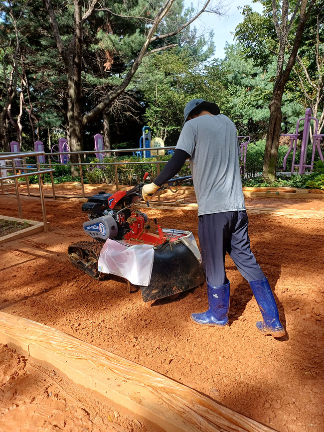 다른 1곳인 구미동 공공공지 내 750m 길이의 황톳길은 로터리 기기를 내년도에 추가 구매한 뒤 흙 뒤집기 작업을 한다.