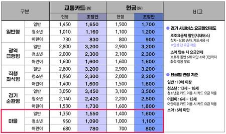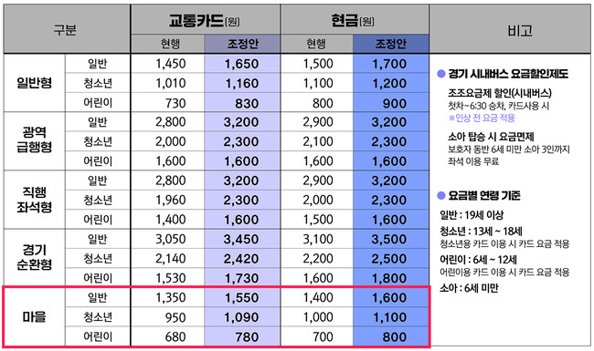 그 결과 교통카드 기준 △ 일반 시내버스 요금은 성인 1,450원→1,650원, 청소년 1,010원→1,160원, 어린이 730원→830원 △ 직행좌석형과 광역급행형(M) 버스는 성인 2,800원→3,200원, 청소년 1,960원→2,300원, 어린이 1,400원→1,600원 △ 경기순환형 버스는 성인 3,050원→3,450원, 청소년 2,140원→2,420원, 어린이 1,530원→1,730원 △ 마을버스 요금은 성인 1,350원→1,550원, 청소년 950원→1,090원, 어린이 680원→780원으로 각각 인상된다.