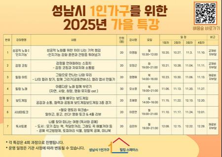 성남시(시장 신상진)는 오는 10월 20일부터 12월 29일까지 중원구 하대원동 1인 가구 힐링스페이스에서 총 150명이 참여하는 7개 과목(과목별 20~30명)의 특강을 연다.