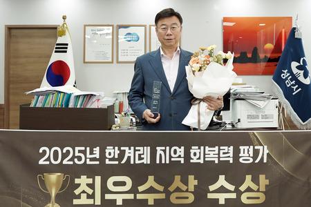 성남시(시장 신상진)는 서울 중구 대한상공회의소에서 열린 ‘2025 한겨레 지역 회복력 평가’ 시상식에서 전국 226개 기초지자체 중 종합 4위, 상위권에 이름을 올리며 최우수 지자체로 선정됐다.
