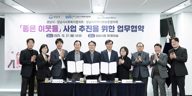 시는 10월 27일 오전 10시 시청 4층 제1회의실에서 임종철 성남시 부시장과 노만호 성남시사회복지협의회장, 이상무 성남시지역사회보장협의체 민간공동위원장 등이 참석한 가운데 ‘좋은 이웃들 사업 추진을 위한 업무협약’을 체결했다.