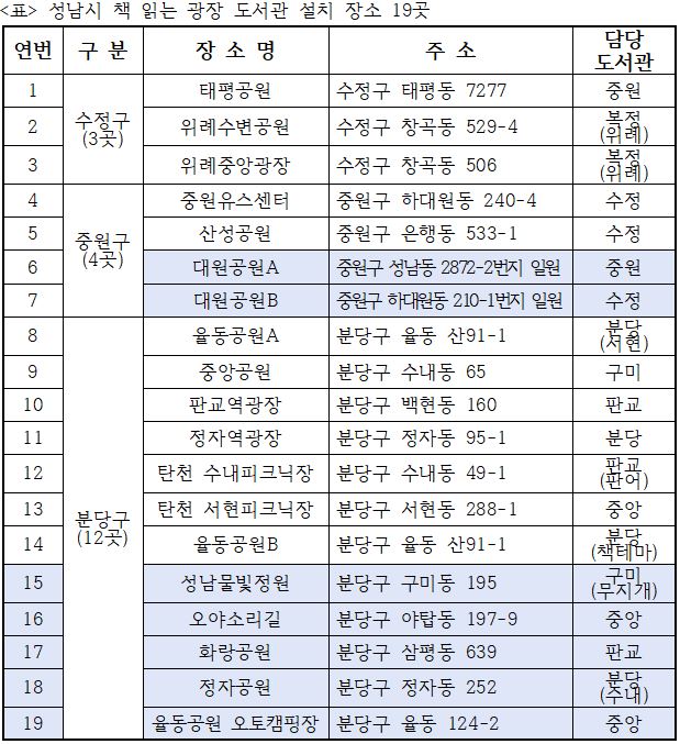 책 읽는 광장 도서관이 새로 조성된 곳은 대원공원(2곳), 구미동 성남물빛공원, 야탑3동 오야소리길, 삼평동 화랑공원, 정자공원, 율동공원 오토캠핑장 등이다.