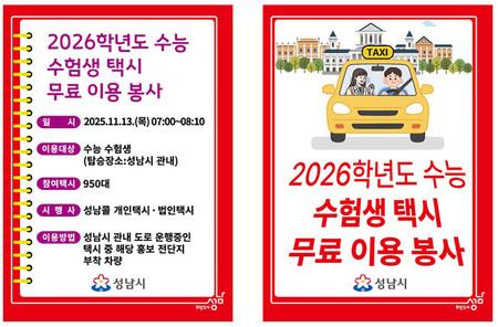 개인택시와 법인택시 총 950여 대가 오전 7시부터 8시까지 ‘2026학년도 수능 수험생 택시 무료 이용 봉사’ 표지를 부착하고, 수험생을 대상으로 시험장까지 무료 운행 서비스를 제공한다. 수험생은 성남콜택시(031-755-4000)를 통해 택시를 호출하면 시험장까지 무료로 이동할 수 있다.