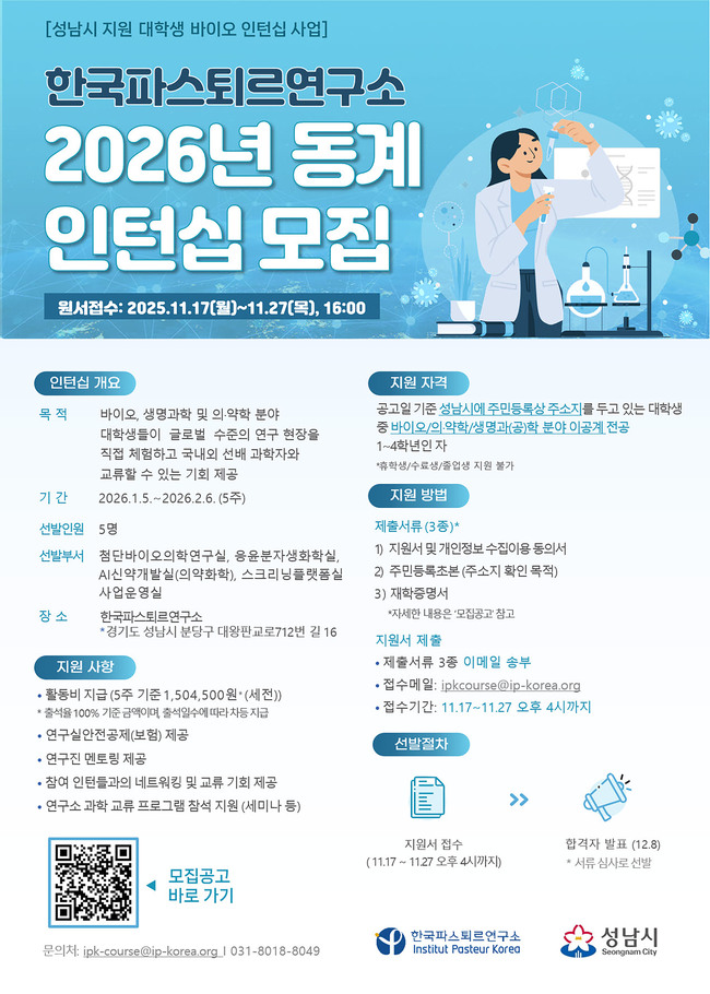 한국파스퇴르연구소가 주관하고 성남시가 지원하는 이번 프로그램은 바이오산업 분야 인재 양성을 위한 보조사업으로, 성남 거주 대학생들에게 글로벌 수준의 연구 현장을 직접 체험할 기회를 제공한다.