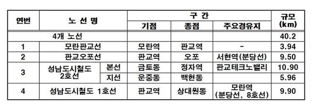 이번 계획에 반영된 성남시 관련 노선은 모두 4개로, 기존에 반영돼 있던 지하철 8호선 연장사업(모란차량기지~판교역, 3.94km)은 유지됐고, 판교~오포간 철도사업(판교역~오포, 9.5km)은 신규 사업으로 포함됐다.