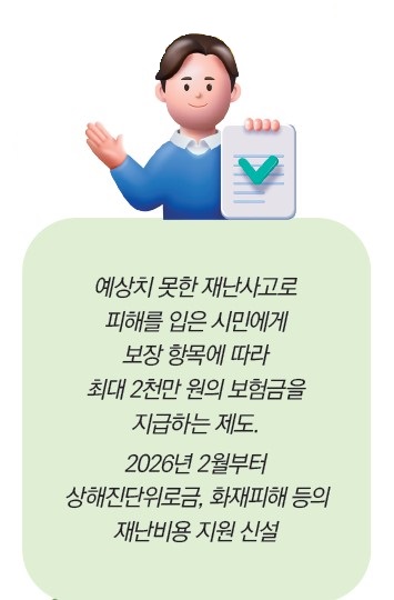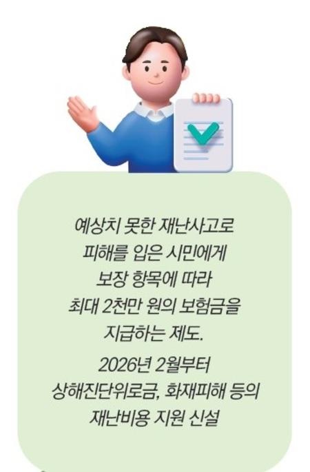 보험기간 2026년 2월 1일~2027년 1월 31일 보험대상 성남시에 주민등록을 두고 있는 모든 시민(외국인 포함, 자동가입) 보장항목 기존 사망, 후유장애 한정 보장(12개) → 일상생활 상해사고까지 보장(14개)
