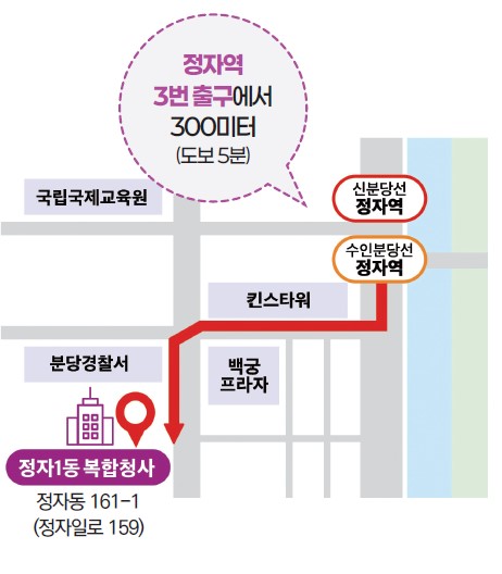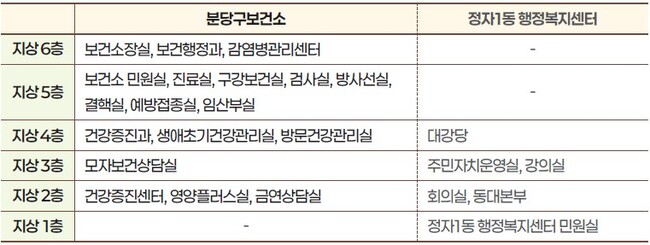 분당구보건소 야탑동 현 위치 신축(2028년 완공 예정)에 따라 2026년 2월 9일(월)부터 정자1동 복합청사에서 새롭게 업무를 시작합니다.