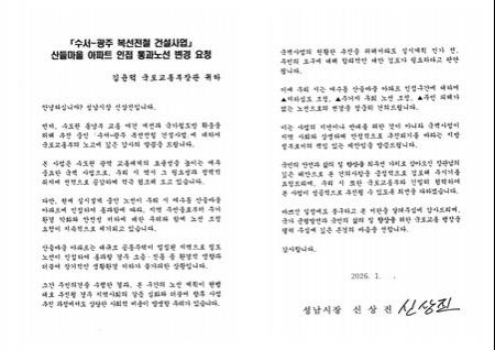 성남시는 지난 16일 김윤덕 국토교통부 장관과 이성해 국가철도공단 이사장에게 ‘수서~광주 복선전철(이하 수광선) 건설사업’과 관련하여 여수동 산들마을 아파트 인접 통과 구간의 노선 변경을 요청하는 서한을 전달했다.