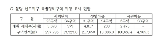 이번에 지정 고시된 구역은 분당 선도지구 4곳 총 7개 구역 중 결합 개발이 예정된 3곳 6개 구역이다. 구체적으로는 ▲ 시범단지(23구역-S6구역) ▲ 샛별마을(31구역-S4구역) ▲ 목련마을(6구역-S3구역)이 해당된다.