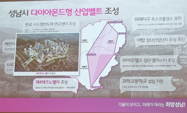 전재환 성남시 행정기획조정실장이 ‘2026년 성남시 시정운영 방향’을 전반적으로 설명했다. 새해 예산 현황과 성남시 다이아몬드형 산업벨트 조성에 대한 설명도 이어졌다.