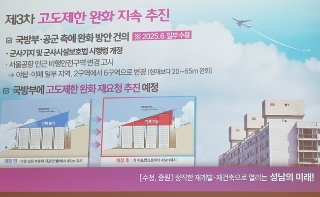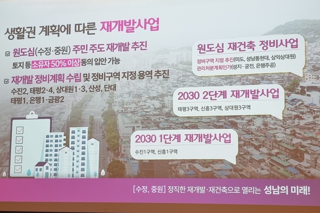 제3차 고도제한 완화 지속 추진, 생활권 계획에 따른 따른 원도심(수정·중원) 주민 주도 재개발 추진, 재개발 정비계획수립 및 정비구역 지정 용역 추진을 위한 ‘정직한 재개발·재건축으로 열리는 성남의 미래!’라는 도시개발에 대한 설명도 있었다.