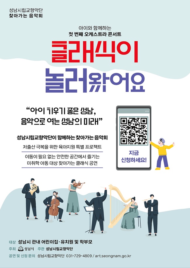 성남시립교향악단의 ‘찾아가는 음악회’는 저출생 극복을 위한 육아 지원 특별 프로젝트로 진행하는 프로그램이다. 안전한 공간에서 즐기는 미취학 아동을 대상으로 찾아가는 클래식 공연이다.