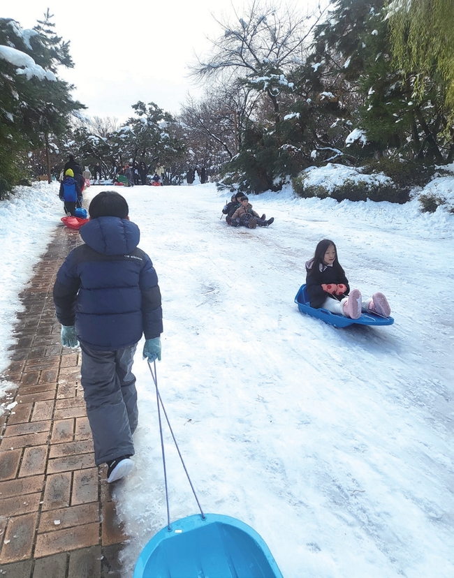 눈이 쌓이면 에코브릿지는 아이들의 눈썰매 다리가 된다.