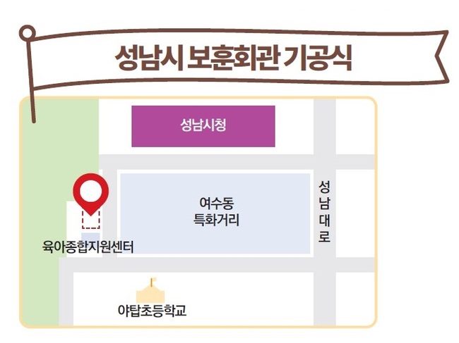 일정 2월 11일(수) 오후 2시 장소 중원구 여수동 374번지(성남시육아종합지원센터 옆) ※ 기존 태평동 뒷골목에서 이전합니다! 개관 2028년 6월 예정 시설안내 보훈단체 사무실(9개), 다목적실, 대강당, 체력 단련실 등(지상 1~3층), 공영주차장(지하 1~2층)