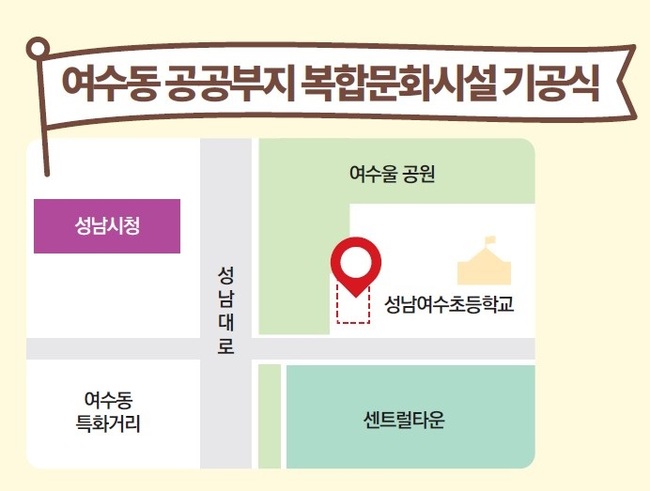 일정 2월 12일(목) 오후 2시 장소 중원구 여수동 400번지(성남대로변 시청 건너편) 개관 2028년 상반기 예정 시설안내 작은도서관, 운동강습실, 음악실, 소극장, 다목적홀, 드론체험실, 문화교실 등(지상 1~4층) 주차장(지하 1~3층)