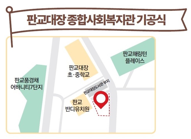 일정 2월 24일(화) 오후 2시 장소 분당구 대장동 631-2번지(판교반디유치원 앞) 개관 2028년 11월 예정 시설안내 수영장, 프로그램실 등(지상 4층~지하 2층 규모)