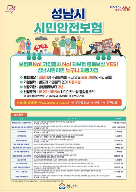 이번 보장 확대에 따라 시민안전보험 보장항목은 기존 12개에서 14개로 늘어났다. 성남시에 주민등록을 둔 시민이라면 외국인을 포함해 별도 가입 절차 없이 자동 가입되며, 개인보험과 중복 적용도 가능하다.