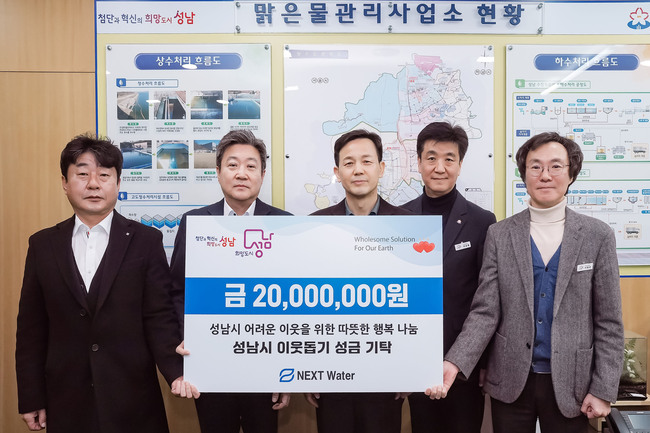 같은 날(2.5) 오전 10시에는 ㈜넥스트워터(성남·판교수질복원센터 관리 대행 운영사)가 시청 5층 맑은물관리사업소장실을 방문해 저소득층의 난방비로 써달라며 성금 2천만 원을 기탁했다.