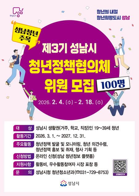 성남시(시장 신상진)는 오는 2월 18일까지 ‘제3기 청년정책협의체’ 위원 100명을 공개 모집한다.