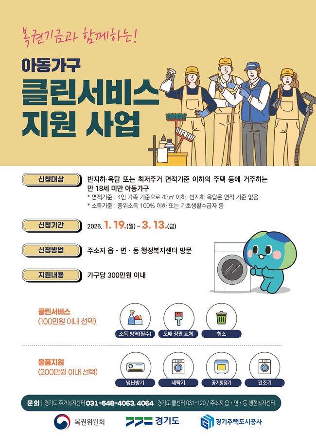 성남시(시장 신상진)는 주거환경이 열악한 곳에 거주하는 아동의 주거환경과 위생 여건을 개선하기 위해 복권기금과 함께 추진하는 ‘아동가구 클린서비스 지원사업’의 대상 가구를 모집한다.