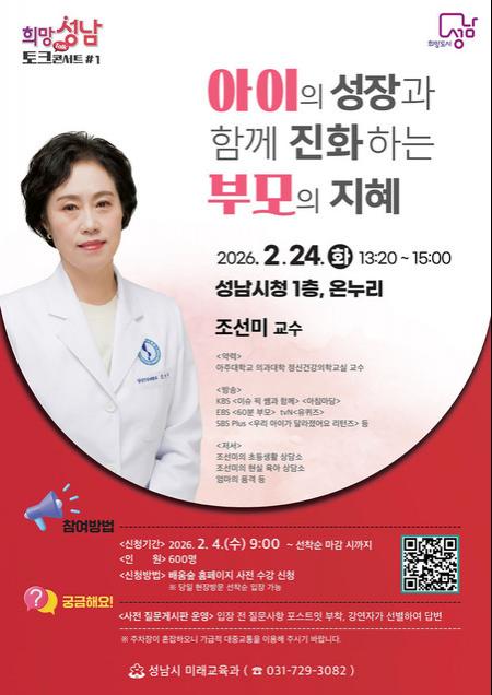성남시(시장 신상진)는 올해 첫 ‘희망성남 토크콘서트’ 강연자로 부모 교육 전문가로 평가받는 조선미 아주대학교 의과대학 정신건강의학 교실 교수를 초빙한다.