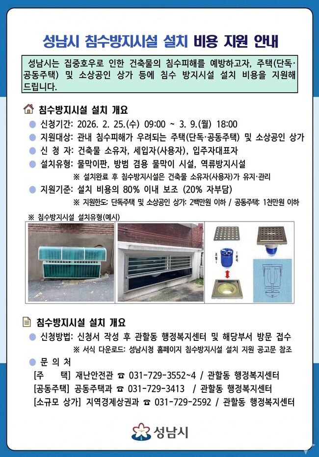 성남시(시장 신상진)는 여름철 집중호우로 인한 주택과 상가의 침수 피해를 사전에 예방하기 위해 침수방지시설 설치 비용을 최대 80%까지 지원한다.