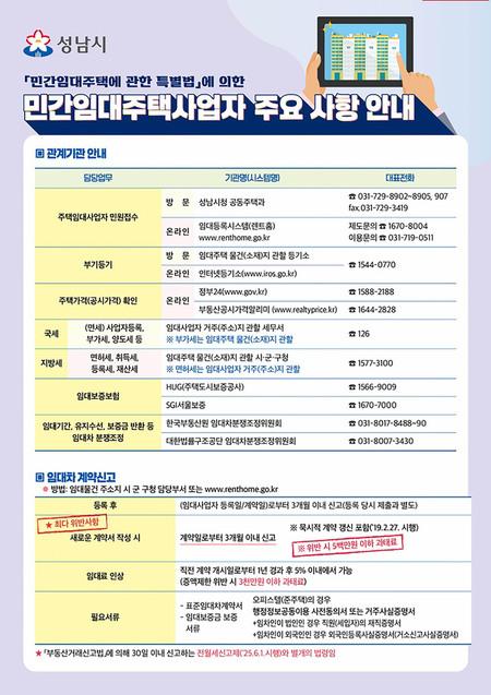 성남시(시장 신상진)는 잦은 법령 개정과 제도 변화로 혼란을 겪는 지역 임대사업자를 지원하기 위해 ‘등록 임대사업자 주요 준수사항’ 안내문을 제작해 발송할 예정이다.