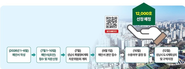 신청대상 분당 특별정비예정구역의 토지등소유자(선도지구 7개 구역 제외) 신청방법 2026년 7월 1~10일 방문 제출(성남시청 신도시정비과, 동관 6층) 제출서류 토지등소유자 과반수 이상의 동의서 및 특별정비계획서 등(공고문 참조)