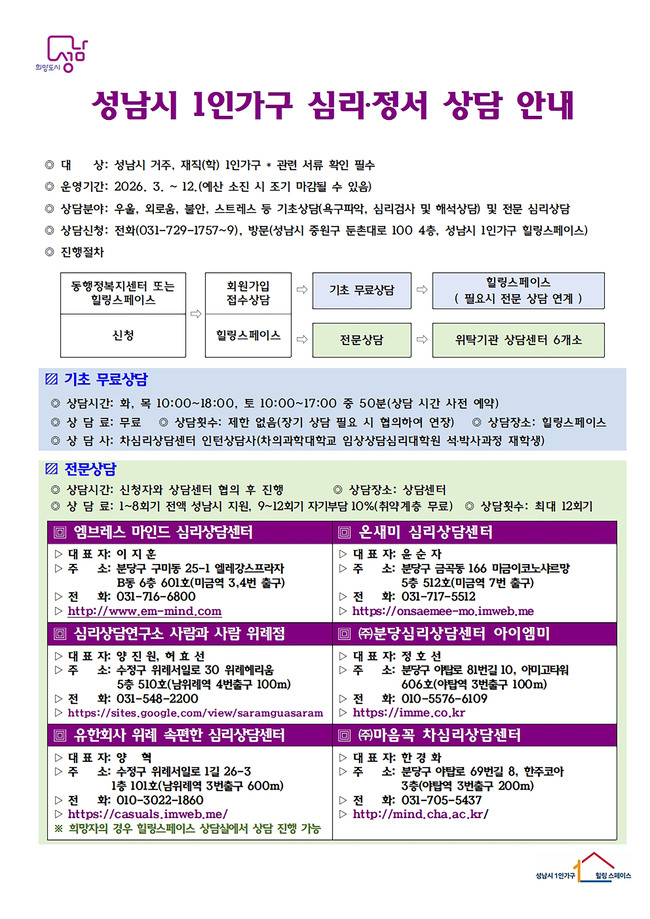 전문상담센터 상담 이전에 성남시 1인가구 힐링스페이스에서 진행하는 ‘기초 무료 상담’도 받을 수 있다. 차의과학대학교 임상심리상담대학원 소속 인턴 상담사들이 주 3회 재능 기부로 심리 정서 상담을 진행한다.