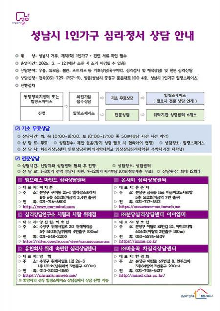 이들 전문상담센터 이용 신청은 성남시 1인가구 힐링 스페이스(중원구 둔촌대로 100, 4층, ☏031-729-1756~9)나 거주지 동 행정복지센터 등에서 하면 된다.