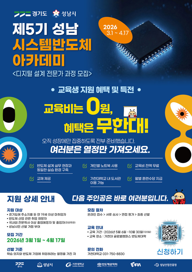성남시(시장 신상진)는 반도체 설계 분야 실무형 인재를 육성하기 위한 ‘성남시 시스템반도체 아카데미’ 교육생을 모집한다고 밝혔다.
