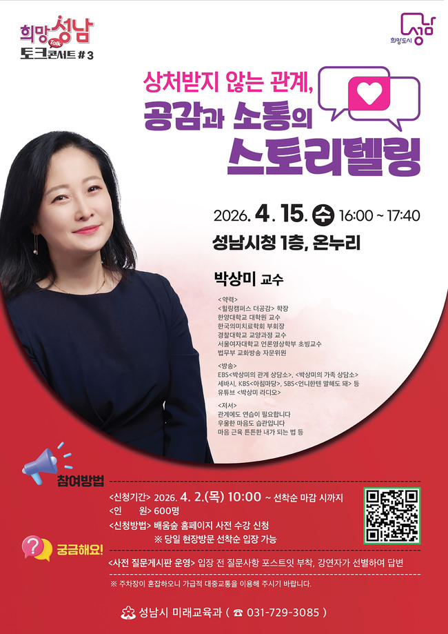성남시(시장 신상진)는 오는 4월 15일 오후 4시 시청 1층 온누리에서 ‘상처받지 않는 관계, 공감과 소통의 스토리텔링’을 주제로 한 명사 초빙 강연을 연다.