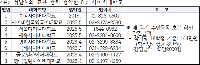 성남시(시장 신상진)는 시민의 교육비를 30% 감면해 주는 사이버대학교를 4곳 추가해 총 8곳으로 확대했다.