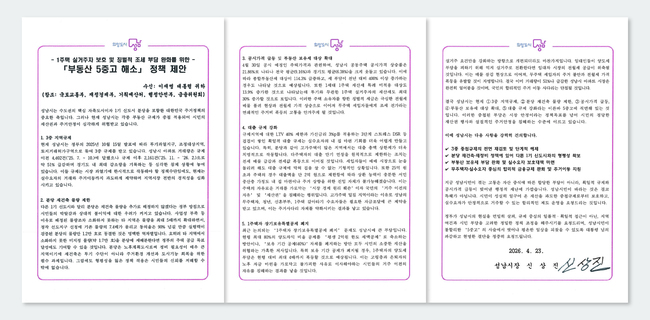 성남시(시장 신상진)는 1주택 실거주자 보호와 과도한 부동산 규제 완화를 위해 이재명 대통령에게 ‘부동산 5중고 해소’를 위한 정책을 제안했다고 밝혔다.